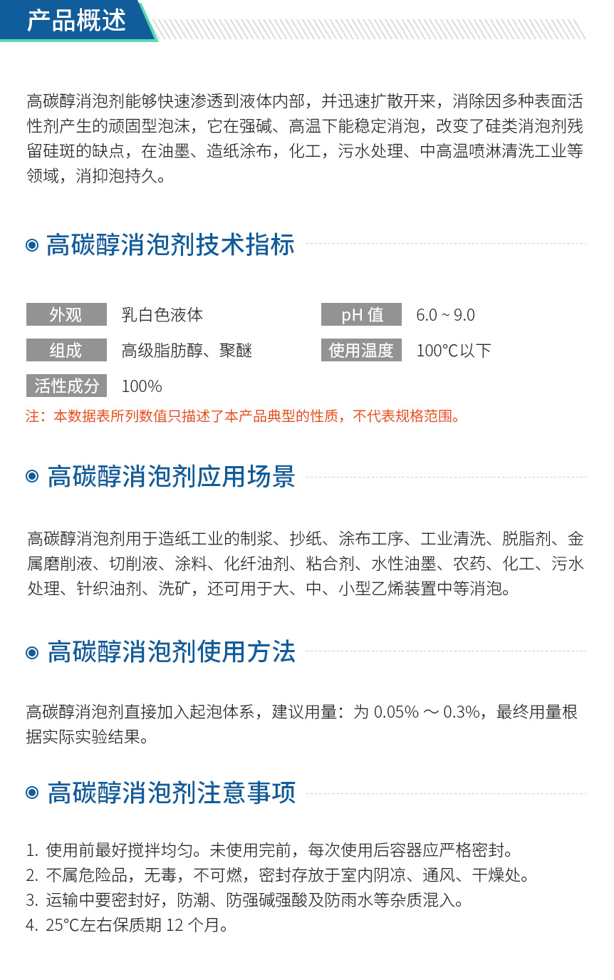 高碳醇消泡剂能够快速渗透到液体内部,并迅速扩散开来,消除因多种表面活性剂产生的顽固型泡沫,它在强碱、高温下能稳定消泡,改变了硅类消泡剂残留硅斑的缺点,在油墨、造纸涂布,化工,污水处理、中高温喷淋清洗工业等领域,消抑泡持久。