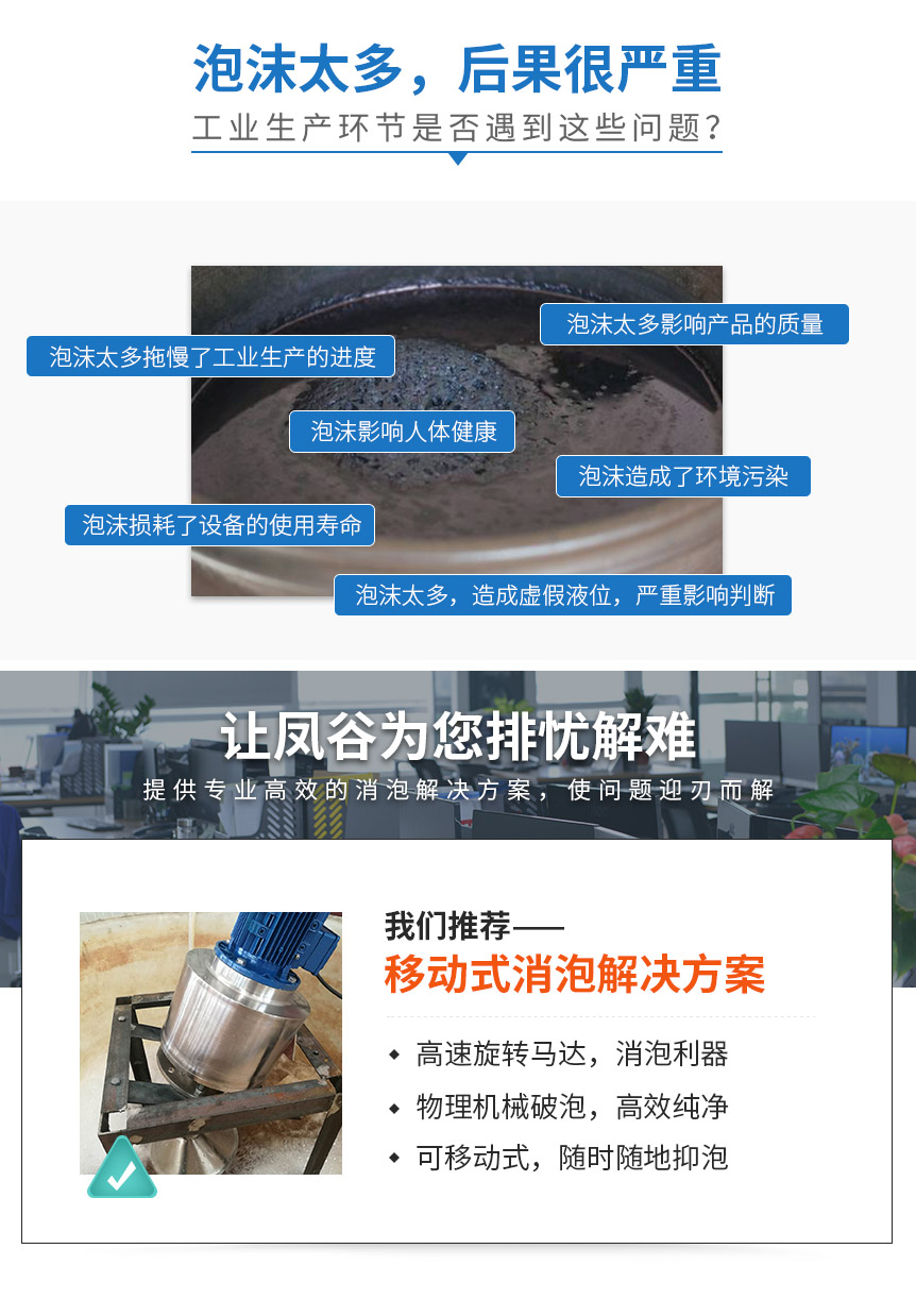 凤谷节能科技根据污水处理、石油、化工、纺织、电镀、PCB、造纸、食品、医药等行业应用场景和消泡需求,为企业提供移动式消泡解决方案,适用于搅拌、萃取、清洗、过滤、发酵、干燥、分离、浓缩、破碎等工艺环节。